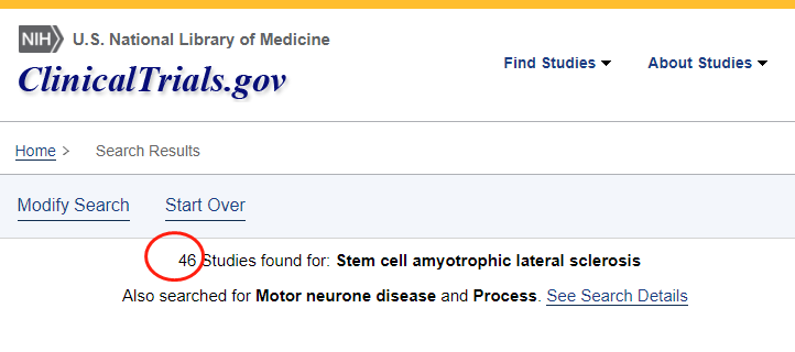 截止2022年11月,在美國國立衛(wèi)生研究院的最大臨床試驗注冊庫clinicaltrials.gov網(wǎng)站上注冊的有關(guān)干細胞治療漸凍癥的臨床研究項目有46項。