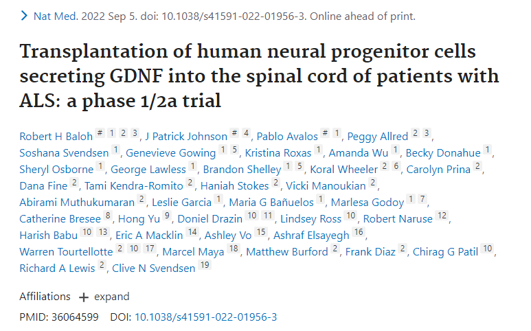 在1/2a期臨床研究(NCT02943850)中,CNS10-NPC-GDNF被移植到18名ALS參與者的腰椎中。主要安全性終點在1年時達到,與未治療腿相比,治療腿的移植對運動功能沒有負面影響。對死于疾病進展的13名參與者的組織分析顯示移植物存活和GDNF產(chǎn)生。