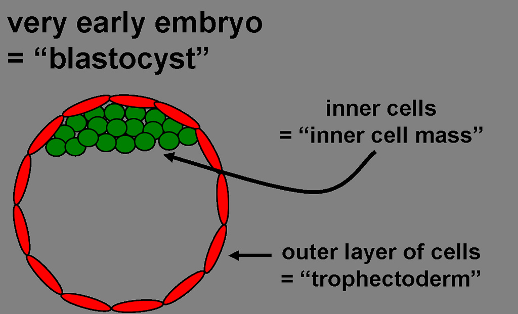 胚胎干細胞是從剛出生幾天的胚胎中發(fā)現(xiàn)的細胞生長而來的。在人類、小鼠和其他哺乳動物中,胚胎在這個階段是一個由大約100個細胞組成的球。它被稱為囊胚 ,分為兩部分:
