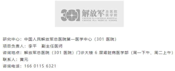 符合上述標(biāo)準(zhǔn)且有意參與的患者,請(qǐng)盡快與解放軍總醫(yī)院第一醫(yī)學(xué)中心腎臟病醫(yī)學(xué)部聯(lián)系,詳細(xì)了解報(bào)名及治療過(guò)程,抓住這一難得的治療機(jī)會(huì)!