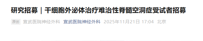 11月21日,宣武醫院神經外科啟動了一項名為”評價人臍帶間充質干細胞外泌體注射液(hUC-MSCs-EV)治療難治性脊髓空洞癥(syringomyelia)患者的臨床安全性和有效性研究。“的臨床招募。[8]