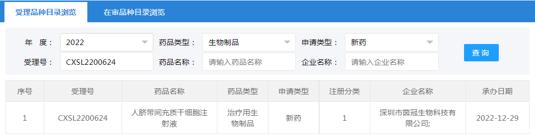 2022年12月29日,深圳市茵冠生物科技有限公司“人臍帶間充質干細胞注射液”的藥物臨床試驗申請獲受理(受理號:CXSL2200624)。這是深圳市茵冠生物第一款獲得受理的干細胞注射。