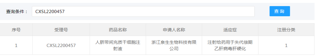 ▉ 干細胞藥物新增默示許可依據(jù)2023年1月2日,CDE官網(wǎng)顯示,浙江泉生生物科技有限公司的“人臍帶間充質干細胞注射液”(受理號:CXSL2200457)獲得新藥臨床試驗默示許可,適應證為:注射給藥用于失代償期乙肝病毒肝硬化。這是該干細胞注射液的第四種適應證,此前已獲得默示許可用于注射給藥輕至中度急性呼吸窘迫綜合征(受理號:CXSL2200114)、強直性脊柱炎(受理號:CXSL2200299)、Ⅱ度燒傷(受理號:CXSL2200301)的臨床試驗。