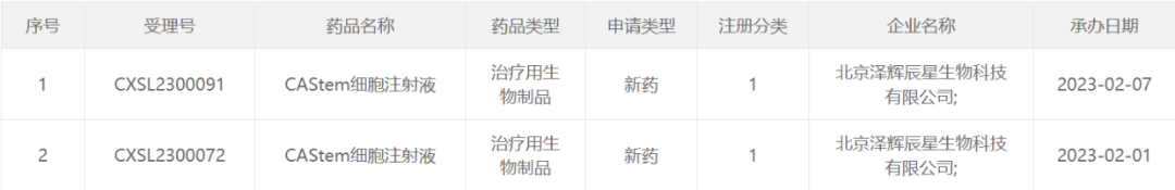 2023年2月7日,據(jù)CDE官網(wǎng)公示,北京澤輝辰星生物科技有限公司(以下簡稱“澤輝生物”)的人胚干細(xì)胞產(chǎn)品“CAStem細(xì)胞注射液”新適應(yīng)癥臨床試驗申請獲得受理(受理號:CXSL2300091)。這是繼今年2月1日后申報的第二項新適應(yīng)癥。